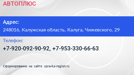 АВТОПЛЮС по адресу 248016, Калужская область, Калуга, Чижевского, 29 в дальнейшем Организация, размещена в следующих категориях: