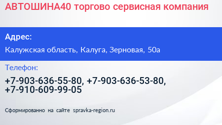 АВТОШИНА40, торгово-сервисная компания по адресу Калужская область, Калуга, Зерновая, 50а в дальнейшем Организация, размещена в следующих категориях: