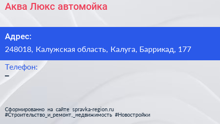 Аква Люкс, автомойка по адресу 248018, Калужская область, Калуга, Баррикад, 177 в дальнейшем Организация, размещена в следующих категориях: