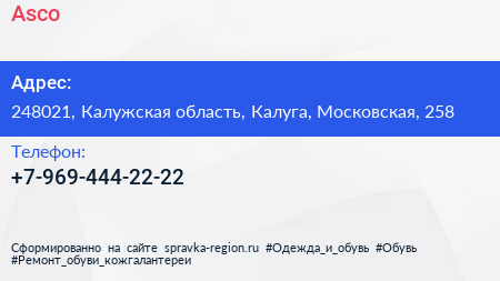 Asco по адресу 248021, Калужская область, Калуга, Московская, 258 в дальнейшем Организация, размещена в следующих категориях:
