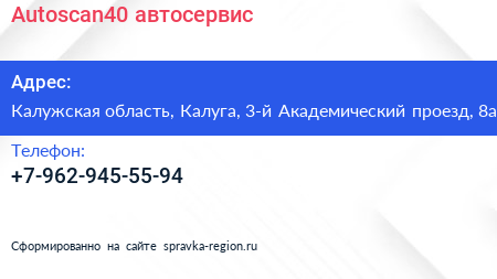 Autoscan40, автосервис по адресу Калужская область, Калуга, 3-й Академический проезд, 8а в дальнейшем Организация, размещена в следующих категориях: