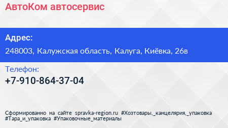 АвтоКом, автосервис по адресу 248003, Калужская область, Калуга, Киёвка, 26в в дальнейшем Организация, размещена в следующих категориях: