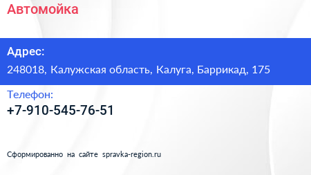 Автомойка по адресу 248018, Калужская область, Калуга, Баррикад, 175 в дальнейшем Организация, размещена в следующих категориях: