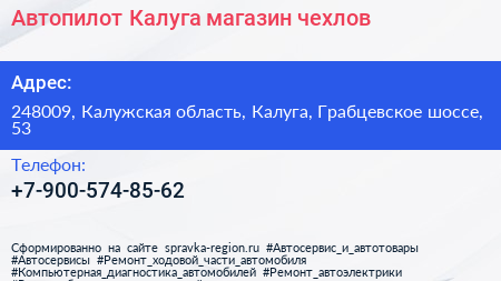 Автопилот Калуга, магазин чехлов по адресу 248009, Калужская область, Калуга, Грабцевское шоссе, 53 в дальнейшем Организация, размещена в следующих категориях: