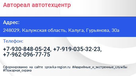 Автореал, автотехцентр по адресу 248029, Калужская область, Калуга, Гурьянова, 30а в дальнейшем Организация, размещена в следующих категориях: