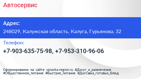Автосервис по адресу 248029, Калужская область, Калуга, Гурьянова, 32 в дальнейшем Организация, размещена в следующих категориях: