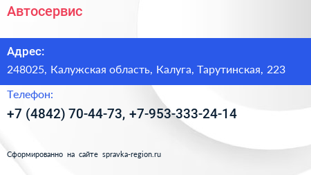 Автосервис по адресу 248025, Калужская область, Калуга, Тарутинская, 223 в дальнейшем Организация, размещена в следующих категориях: