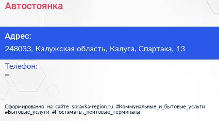 Автостоянка по адресу 248033, Калужская область, Калуга, Спартака, 13 в дальнейшем Организация, размещена в следующих категориях: