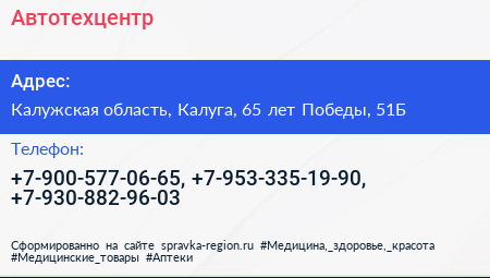 Автотехцентр по адресу Калужская область, Калуга, 65 лет Победы, 51Б в дальнейшем Организация, размещена в следующих категориях: