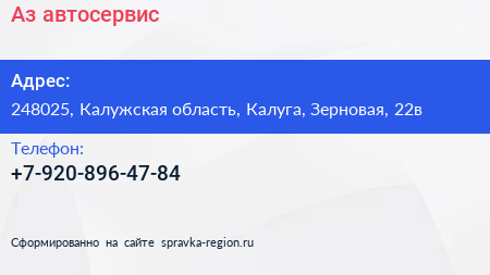 Аз, автосервис по адресу 248025, Калужская область, Калуга, Зерновая, 22в в дальнейшем Организация, размещена в следующих категориях: