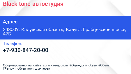 Black tone, автостудия по адресу 248009, Калужская область, Калуга, Грабцевское шоссе, 47Б в дальнейшем Организация, размещена в следующих категориях: