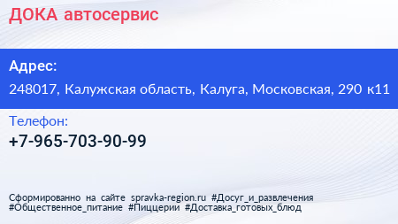 ДОКА, автосервис по адресу 248017, Калужская область, Калуга, Московская, 290 к11 в дальнейшем Организация, размещена в следующих категориях: