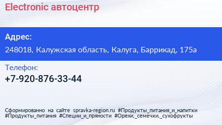 Electronic, автоцентр по адресу 248018, Калужская область, Калуга, Баррикад, 175а в дальнейшем Организация, размещена в следующих категориях: