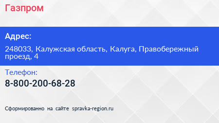 Газпром по адресу 248033, Калужская область, Калуга, Правобережный проезд, 4 в дальнейшем Организация, размещена в следующих категориях: