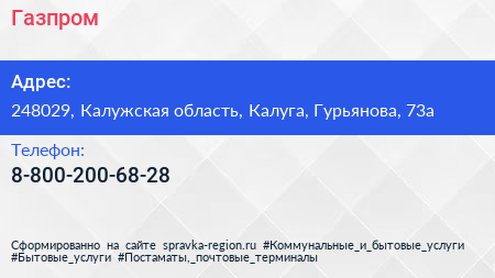 Газпром по адресу 248029, Калужская область, Калуга, Гурьянова, 73а в дальнейшем Организация, размещена в следующих категориях: