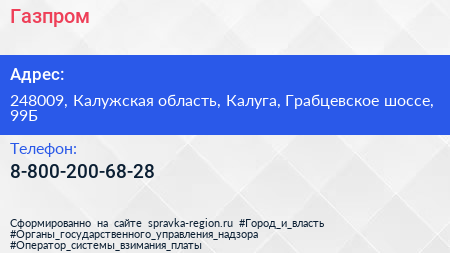 Газпром по адресу 248009, Калужская область, Калуга, Грабцевское шоссе, 99Б в дальнейшем Организация, размещена в следующих категориях: