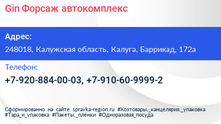 Gin Форсаж, автокомплекс по адресу 248018, Калужская область, Калуга, Баррикад, 172а в дальнейшем Организация, размещена в следующих категориях: