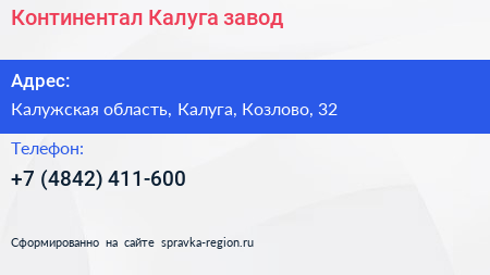Континентал Калуга, завод по адресу Калужская область, Калуга, Козлово, 32 в дальнейшем Организация, размещена в следующих категориях:
