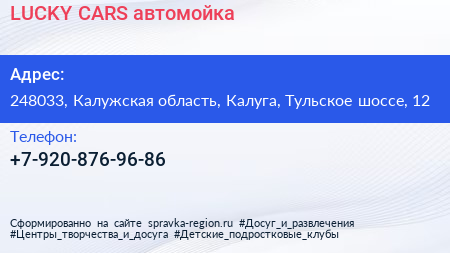 LUCKY CARS, автомойка по адресу 248033, Калужская область, Калуга, Тульское шоссе, 12 в дальнейшем Организация, размещена в следующих категориях: