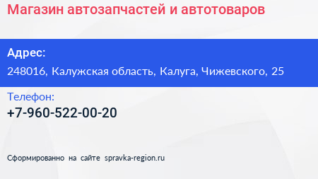 Магазин автозапчастей и автотоваров по адресу 248016, Калужская область, Калуга, Чижевского, 25 в дальнейшем Организация, размещена в следующих категориях: