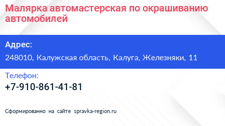 Малярка, автомастерская по окрашиванию автомобилей по адресу 248010, Калужская область, Калуга, Железняки, 11 в дальнейшем Организация, размещена в следующих категориях: