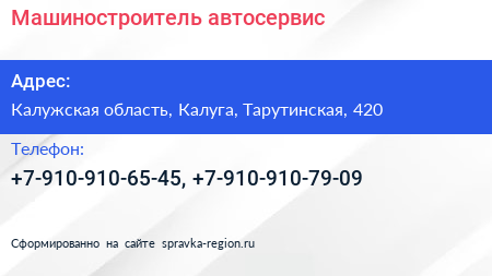 Машиностроитель, автосервис по адресу Калужская область, Калуга, Тарутинская, 420 в дальнейшем Организация, размещена в следующих категориях: