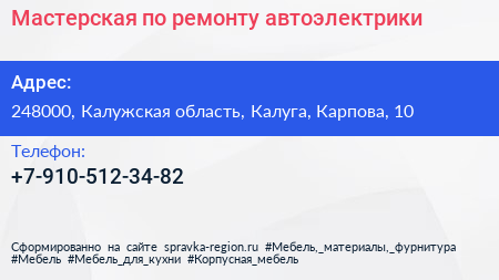 Мастерская по ремонту автоэлектрики по адресу 248000, Калужская область, Калуга, Карпова, 10 в дальнейшем Организация, размещена в следующих категориях: