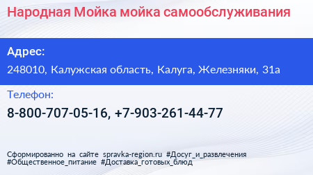 Народная Мойка, мойка самообслуживания по адресу 248010, Калужская область, Калуга, Железняки, 31а в дальнейшем Организация, размещена в следующих категориях: