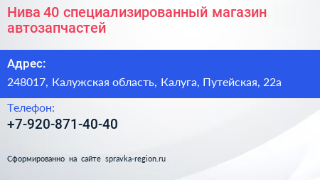 Нива 40, специализированный магазин автозапчастей по адресу 248017, Калужская область, Калуга, Путейская, 22а в дальнейшем Организация, размещена в следующих категориях:
