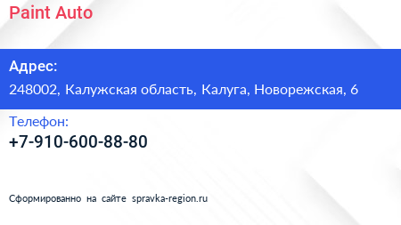 Paint Auto по адресу 248002, Калужская область, Калуга, Новорежская, 6 в дальнейшем Организация, размещена в следующих категориях: