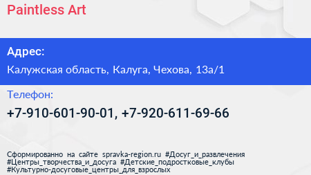 Paintless Art по адресу Калужская область, Калуга, Чехова, 13а/1 в дальнейшем Организация, размещена в следующих категориях: