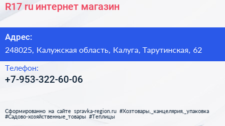 R17.ru, интернет-магазин по адресу 248025, Калужская область, Калуга, Тарутинская, 62 в дальнейшем Организация, размещена в следующих категориях: