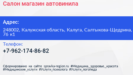Салон-магазин автовинила по адресу 248002, Калужская область, Калуга, Салтыкова-Щедрина, 76 к1 в дальнейшем Организация, размещена в следующих категориях: