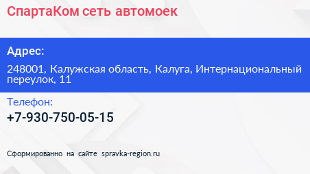 СпартаКом, сеть автомоек по адресу 248001, Калужская область, Калуга, Интернациональный переулок, 11 в дальнейшем Организация, размещена в следующих категориях: