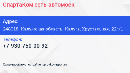 СпартаКом, сеть автомоек по адресу 248018, Калужская область, Калуга, Хрустальная, 22г/1 в дальнейшем Организация, размещена в следующих категориях: