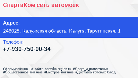 СпартаКом, сеть автомоек по адресу 248025, Калужская область, Калуга, Тарутинская, 1 в дальнейшем Организация, размещена в следующих категориях: