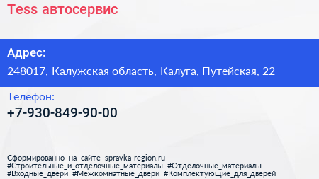 Tess, автосервис по адресу 248017, Калужская область, Калуга, Путейская, 22 в дальнейшем Организация, размещена в следующих категориях:
