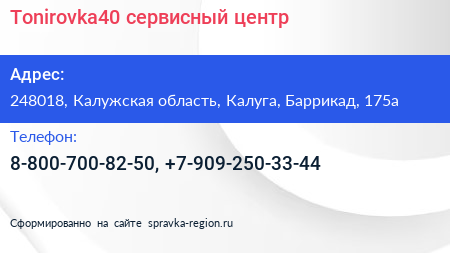 Tonirovka40, сервисный центр по адресу 248018, Калужская область, Калуга, Баррикад, 175а в дальнейшем Организация, размещена в следующих категориях: