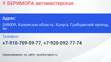 У БЕРИМОРА, автомастерская по адресу 248009, Калужская область, Калуга, Грабцевский проезд, 6а в дальнейшем Организация, размещена в следующих категориях: