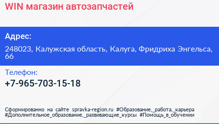 WIN, магазин автозапчастей по адресу 248023, Калужская область, Калуга, Фридриха Энгельса, 66 в дальнейшем Организация, размещена в следующих категориях: