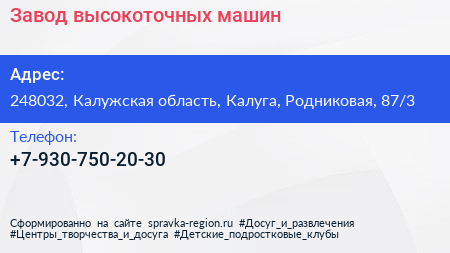 Завод высокоточных машин по адресу 248032, Калужская область, Калуга, Родниковая, 87/3 в дальнейшем Организация, размещена в следующих категориях: