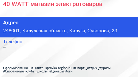 40 WATT, магазин электротоваров по адресу 248001, Калужская область, Калуга, Суворова, 23 в дальнейшем Организация, размещена в следующих категориях: