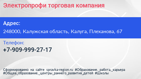 Электропрофи, торговая компания по адресу 248000, Калужская область, Калуга, Плеханова, 67 в дальнейшем Организация, размещена в следующих категориях: