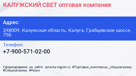 КАЛУЖСКИЙ СВЕТ, оптовая компания по адресу 248009, Калужская область, Калуга, Грабцевское шоссе, 75Б в дальнейшем Организация, размещена в следующих категориях: