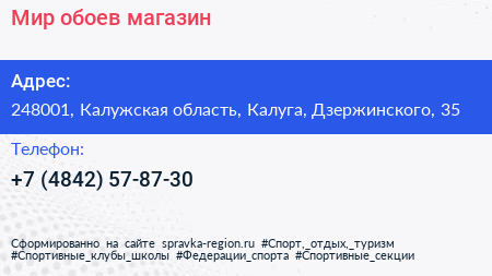 Мир обоев, магазин по адресу 248001, Калужская область, Калуга, Дзержинского, 35 в дальнейшем Организация, размещена в следующих категориях:
