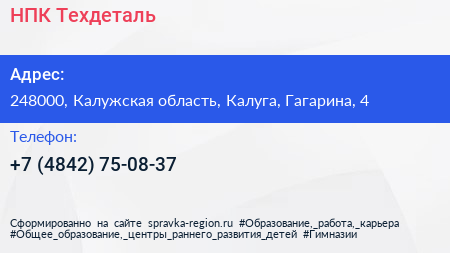 НПК Техдеталь по адресу 248000, Калужская область, Калуга, Гагарина, 4 в дальнейшем Организация, размещена в следующих категориях: