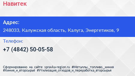 Навитек по адресу 248033, Калужская область, Калуга, Энергетиков, 9 в дальнейшем Организация, размещена в следующих категориях: