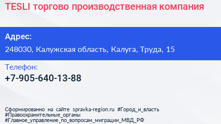 TESLI, торгово-производственная компания по адресу 248030, Калужская область, Калуга, Труда, 15 в дальнейшем Организация, размещена в следующих категориях:
