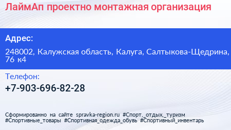 ЛаймАп, проектно-монтажная организация по адресу 248002, Калужская область, Калуга, Салтыкова-Щедрина, 76 к4 в дальнейшем Организация, размещена в следующих категориях: