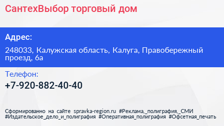 СантехВыбор, торговый дом по адресу 248033, Калужская область, Калуга, Правобережный проезд, 6а в дальнейшем Организация, размещена в следующих категориях: